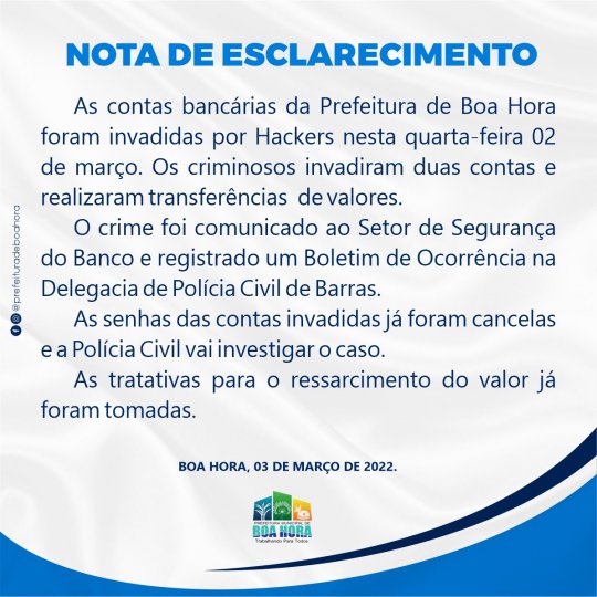 Duas contas bancárias do município de Boa Hora (PI) foram alvo de invasão por criminosos virtuais nesta quarta-feira (02). Segundo informações da prefeitura, os criminosos realizaram duas transferência de valores, mas não foi divulgado o valor da quantia.