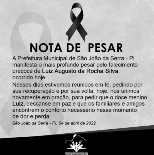 A Prefeitura de São João da Serra (PI) emitiu uma nota de pesar: