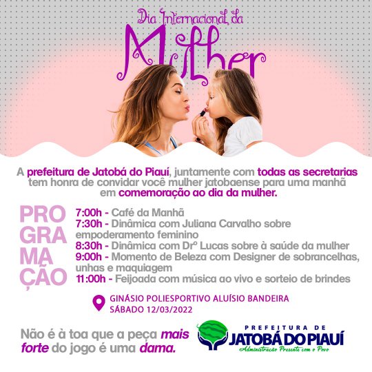 A prefeitura de Jatobá do Piauí, juntamente com todas as secretarias tem honra de convidar as mulheres jatobaense para uma manhã cheia de comemoração ao dia mulher. A festividade será no sábado (12) no Ginásio Poliesportivo Aluísio Bandeira.
