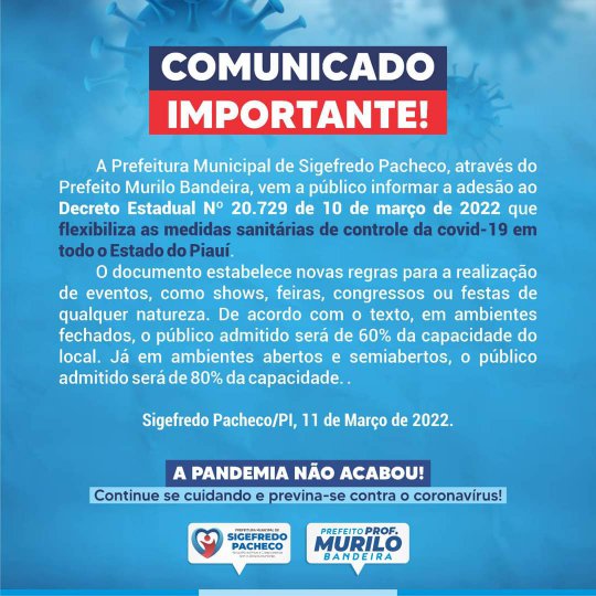 A Prefeitura Municipal de Sigefredo Pacheco (PI), através do Prefeito Murilo Bandeira, vem a público informar a adesão ao Decreto Estadual N° 20.729 de 10 de março de 2022 que flexibiliza as medidas sanitárias de controle da covid-19 em todo o Estado do Piauí.