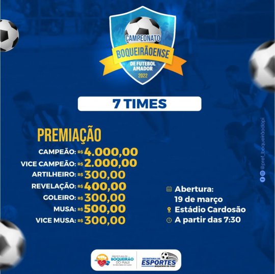 A abertura da competição acontece neste sábado, dia 19 de março a partir das 7 da horas no Estádio Cardosão e encerra no dia 1º de maio na tradicional Festa do Trabalhador em Boqueirão do Piauí.
