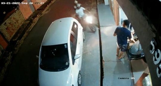 Uma imagem de câmera de segurança registrou o crime. O caso aconteceu na rua João Evangelista de Sá. As imagens mostram o policial dentro da garagem de casa, sem camisa, e o amigo do policial, vestindo camiseta azul.