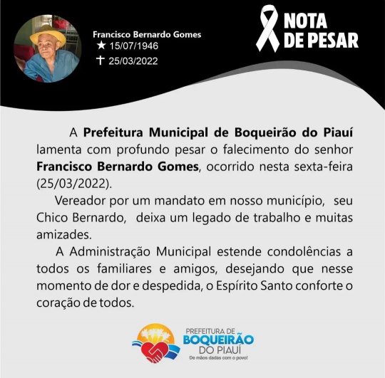 A Prefeitura Municipal de Boqueirão do Piauí lamentou com profundo pesar o falecimento do senhor Francisco Bernardo Gomes, ocorrido nesta sexta-feira (25/03/2022).