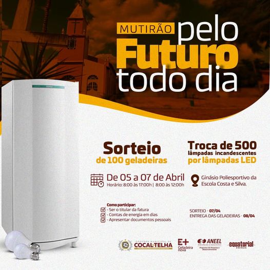 Nos próximos dias 05 a 07 de abril, a prefeitura de Cocal de Telha (PI), por meio da Equatorial, da ANEEL e da E+ Geladeira, estarão realizando uma ação de sorteio de geladeiras e a troca de lâmpadas no Ginásio Poliesportivo da Escola Costa e Silva.