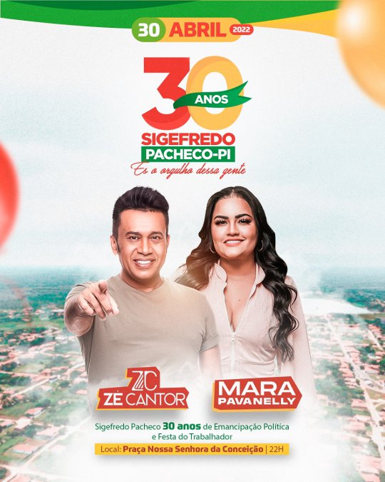 O município de Sigefredo Pacheco estar completando 30 anos de emancipação política no dia 29 de abril, e para comemorar o aniversário da cidade e festa do trabalhador o prefeito Murilo Bandeira fez a divulgação oficial das principais atrações que estarão fazendo as comemorações alusivas no dia 30 de abril.