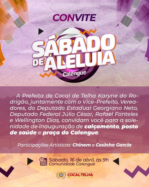 A prefeitura de Cocal de Telha (PI), através da prefieta Karyne do Rodrigão, convida a todos para participar da solenidade de inauguração de obras de calçamento, posto de saúde e praça na comunidade Calengue, juntamente com o Vice-Prefeito, Vereadores, do Deputado Estadual Georgiano Neto, Deputado Federal Júlio César, Rafael Fonteles e Wellington Dias.