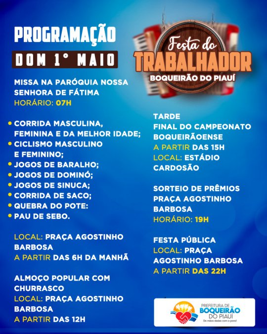 A Prefeitura de Boqueirão do Piauí divulgou nesta sábado a programação da tradicional Festa do Trabalhador que acontece no município.