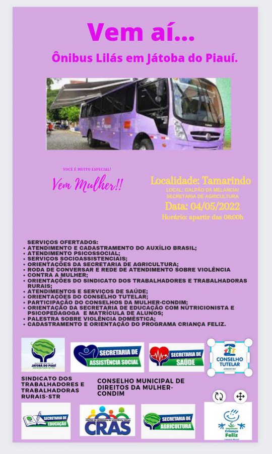 A passagem do Ônibus Lilás, projeto da Coordenadoria Estadual de Políticas para as Mulheres (CEPM-PI), em parceria com a Prefeitura e as secretárias municipais, será realizada no dia 04 de maio apartir das 8hrs no município de Jatobá do Piauí, na comunidade Tamarindo, no Galpão da Melancia, onde estará oferecendo os serviços de assistência jurídica, psicossocial. Confira!