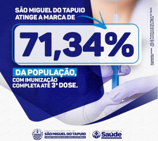 A cidade de São Miguel do Tapuio (PI), atingiu a marca de 71, 34% da população vacinada com a Dose de Reforço. Essa é uma grande conquista no combate a pandemia, bem como uma importante meta alcançada para que possa flexibilizar o uso de máscara em locais fechados, de acordo com as orientações do COE.