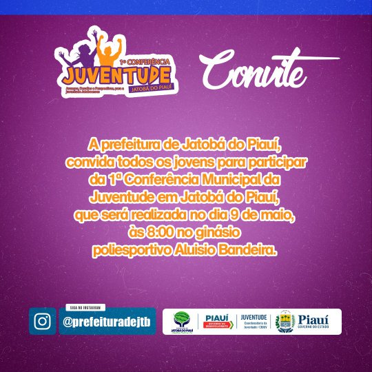 A Prefeitura de Jatobá do Piauí convida todos para a 1° Conferência da Juventude em Jatobá do Piauí com o tema: "Avanços, Desafios e Pespectivas, para a juventude jatobaense".