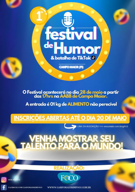 O Portal Campo Maior em Foco informa que já esta aberta as inscrições para o 1º Festival de Humor e Batalha do TikTok de Campo Maior (PI). O Festival acontecerá no dia 28 de maio na AABB de Campo Maior, com a entrada para o público em geral é de 01 kg de alimento não perecível.