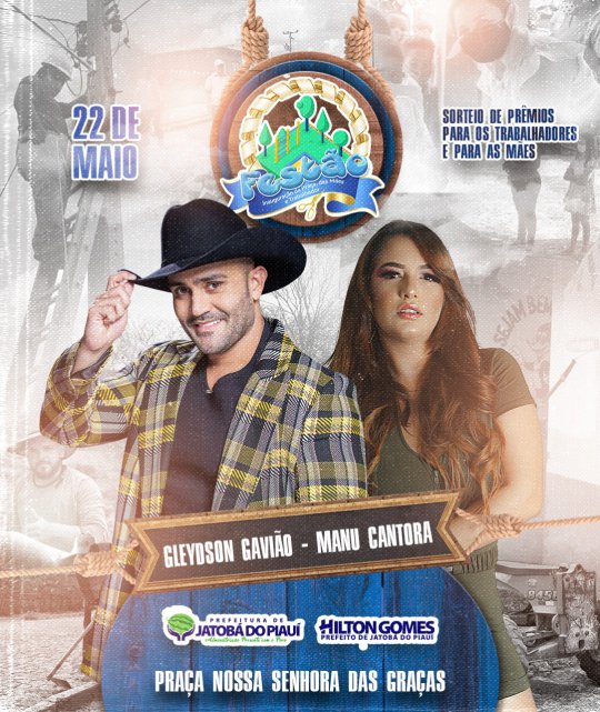 A Prefeitura de Jatobá do Piauí realizará no domingo, dia 22 de maio, festa de inauguração da nova praça Nossa Senhora das Graças com Gleydson Gavião e Manu Cantora. A festa também será em homenagem ao dia do Trabalhador e dia das Mães.