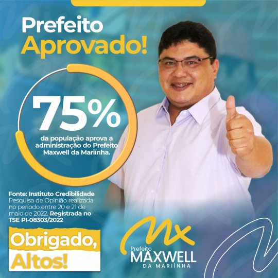 Uma pesquisa realizada pelo Instituto Credibilidade, mostrou que 75% dos altoenses aprovam a gestão do Prefeito Maxwell da Mariinha na cidade de Altos (PI).