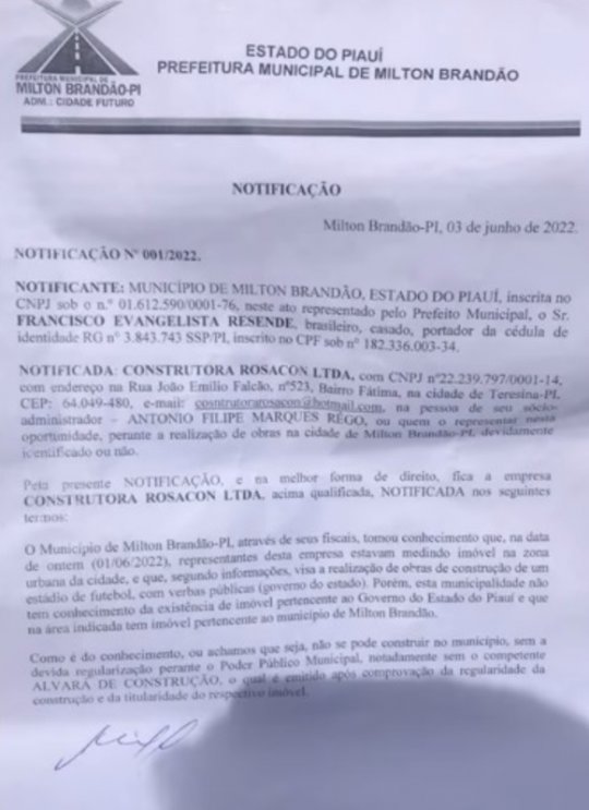O parlamentar mostrou uma notificação assinada pelo prefeito, onde o texto afirma que o terreno onde seria construído o estádio pertence ao município que não foi pedido nenhum alvará de construção de qualquer obra por parte da empresam que supostamente comandará a obra.