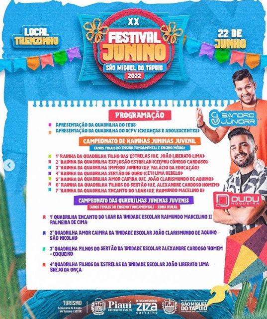 Nesta terça-feira foi realizado a abertura oficial da XX Edição do Festival Junino de São Miguel do Tapuio (PI). Milhares de pessoas acompanharam apresentações de quadrilhas infantis e shows com as bandas Toca do Vale e Valdo Felipe.