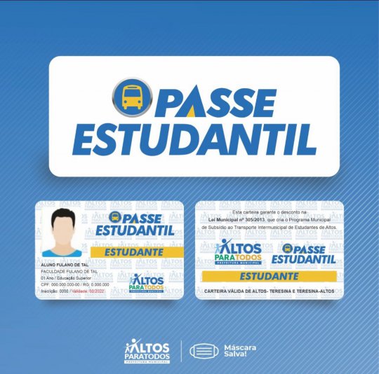A Prefeitura Municipal de Altos informa aos estudantes, que iniciou desde o dia 20 de junho a última fase de novos cadastros para ter acesso ao desconto de 30% no valor do passe estudantil.