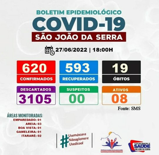 A Prefeitura Municipal de São João da Serra através da Secretaria de Saúde, emitiu nesta segunda-feira (27) o boletim epidemiológico da covid-19. Segundo os dados, a cidade segue com 620 confirmados, 19 óbitos, e 08 ativos, ainda segundo o boletim, as áreas em monitoramento são: Contente, Emparedado, Areia, Boa Vista e Gameleira
