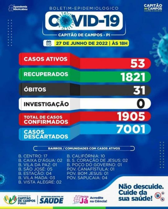 A Prefeitura Municipal de Capitão de Campos (PI) através da Secretaria de Saúde, emitiu nesta segunda-feira (27) o boletim epidemiológico da covid-19.