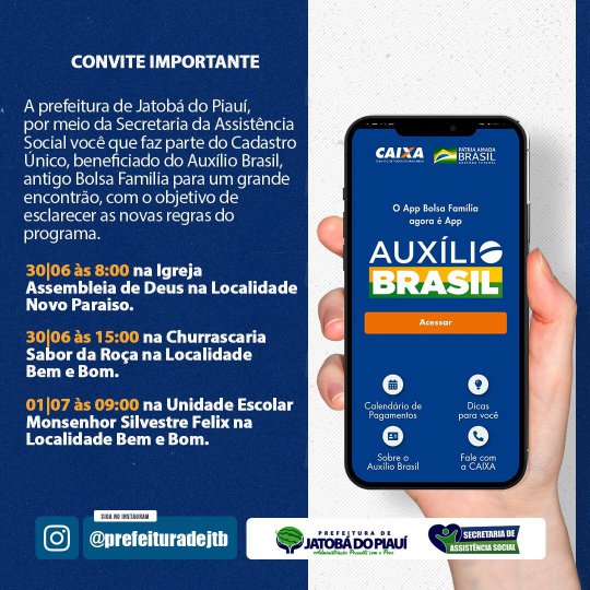 A prefeitura de Jatobá do Piauí, por meio da Secretaria da Assistência Social, informa aos usuários do Cadastro Único, beneficiado pelo Auxílio Brasil, antigo Bolsa Familia, que haverá um grande encontrão em diferentes locais do município para esclarecer as novas regras do programa.