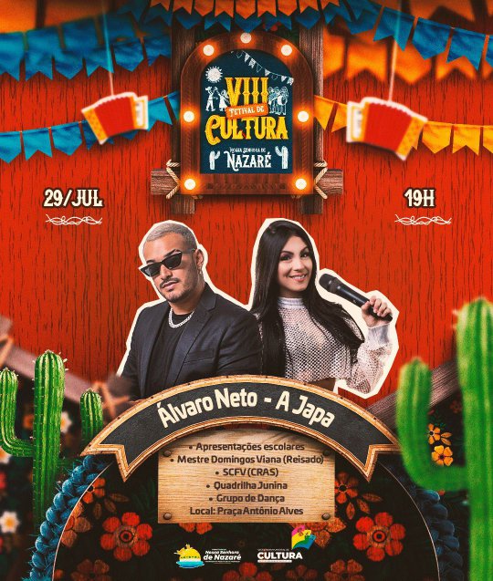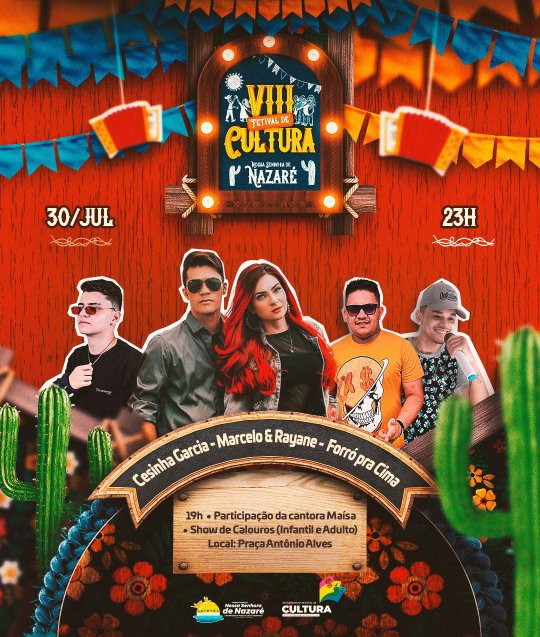 O VIII festival de cultura de Nossa Senhora de Nazaré está se aproximando! com a abertura no 28 de julho, que inicia com a final do campeonato amador de futsal às 19h, e logo após muita música boa com Henrique Sousa, Bob Forro Agyto e Pisada Mix.