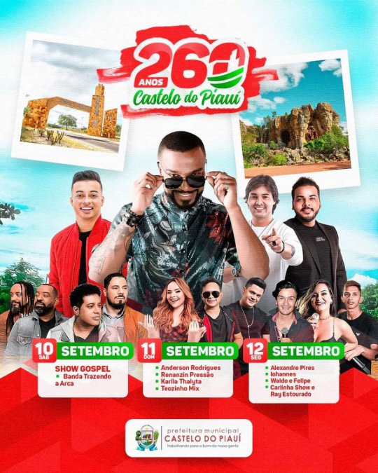 A Prefeitura de Castelo do Piauí divulgou neste domingo (21) a programação completa do aniversário de 260 anos da cidade, que iniciará no dia 10 de setembro, com a abertura sendo feita pelos shows golspel da banda 'Trazendo a Arca'. A programação segue no dia 11 de setembro com grande show de Anderson Rodrigues, Renazin Pressão, Karla Thalitta, Teozinho Mix.