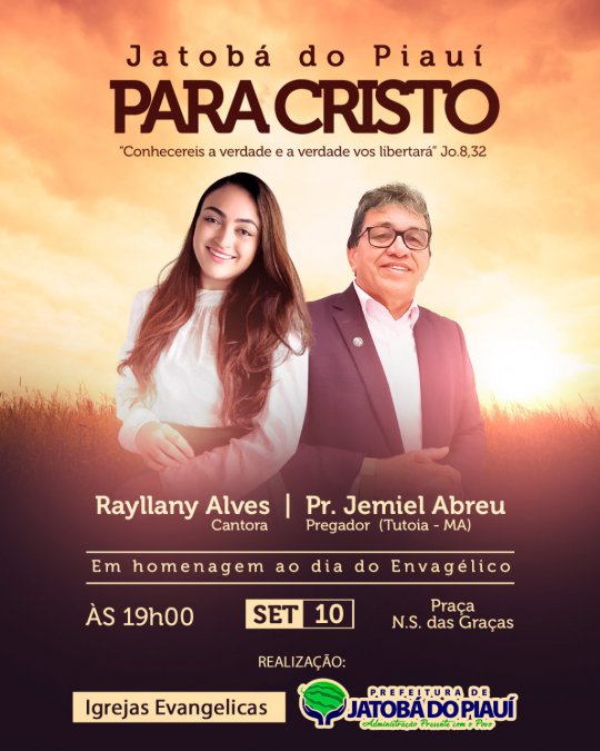 O Dia do Evangélico será celebrado em 10 de setembro, a Partir das 19h, na Praça Nossa Srª das Graças, em Jatobá do Piauí.