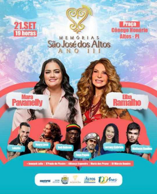 O tradicional show da rádio realizado no dia 21 de setembro está de volta, com grande atrações. Este ano em comemoração ao centenário da cidade de Altos (PI), a Secretaria de Cultura com apoio da Prefeitura de Altos, já iniciou a divulgação da programação oficial que terá como atração principal, Elba Ramalho, Mara Pavanelly e Luketta. Outras atrações locais e regionais marcarão presença no evento que iniciar´as 19hrs.