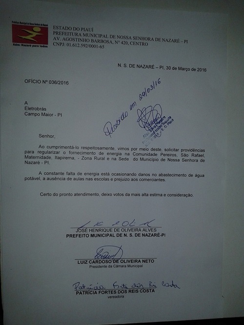 Pré - Candidato a Prefeito de Nossa Senhora de Nazaré, O vereador presidente da câmara Luizinho Cardoso esteve hoje acompanhado do prefeito Zé Henrique e da Vereadora Patricia Fortes na Eletrobrás em Campo Maior solicitando providências pra evitar as constantes falta de energia elétrica no município. Aproveitou a oportunidade e solicitou também uma verificação no transformador e na qualidade da energia do Pov. Pereiros na zona rural do municipio.