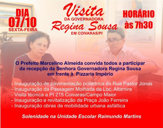 A Governadora Regina Sousa realizará nesta sexta-feira (07) uma visita em Coivaras (PI) para a inauguração de diversas obras na cidade. O Prefeito Marcelino Almeida, recepcionará a gestora em frente ao Pizza Império a partir das 07:30hrs da manhã. A solenidade ocorrerá na Unidade Escolar Raimundo Martins.