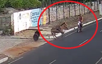 Um acidente inusitado foi registrado por câmeras de segurança no final da tarde desta sexta-feira (07), quando um motociclista identificado como João Borges foi atropelado por um cavalo desgovernado na avenida Pedro Coelho de Resende em Boa Hora (PI).