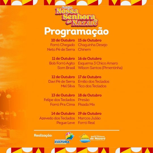 A Prefeitura de Nossa Senhora de Nazaré (PI) através da Secretaria de Cultura divulgou a programação do tradicional festejo de Nossa Senhora de Nazaré, que inicia nesta segunda-feira (10) de outubro e vai até o dia (20) com bandas e shows musicais das noites de festejos.
