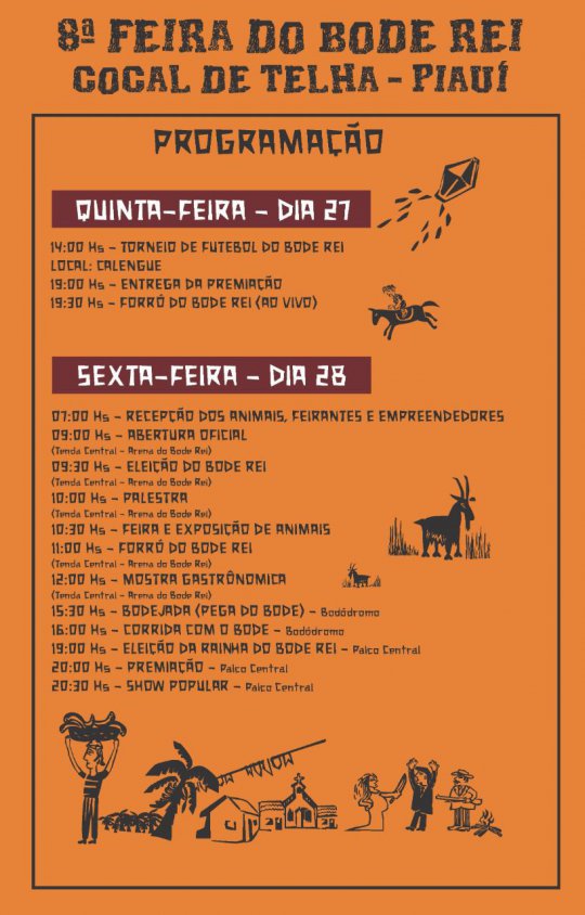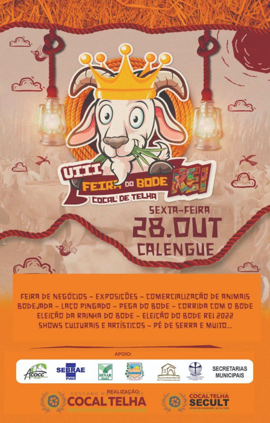 A Prefeitura de Cocal de Telha (PI) através da Secretária de Cultura em parceria com a Associação de criadores de caprinos e ovinos realizará no dia 28 sexta-feira de outubro a tradicional 8° Feira do Bode rei na comunidade Calengue.
