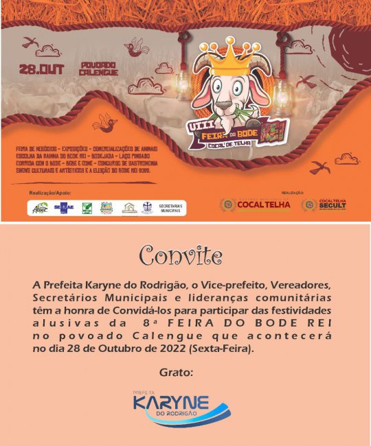 "Pronto! Pode respirar tranquilo e agradecer! A espera acabou! Com muitas atrações, shows, concursos, comercialização de animais é muito mais, teremos a VIII edição da tradicional Feira do Bode Rei em outubro no Calengue. De já te convido para esse retorno triunfal da nossa melhor e maior festa tradicionalmente Cocatelhense!", disse a prefeita Karyne.