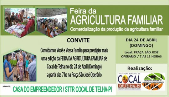 Prefeitura de Cocal de Telha, através da Secretaria Municipal de Agricultura e Abastecimento e em parceria com o Sindicato dos Trabalhadores Rurais do município e Casa do Empreendedor realizará no próximo domingo, dia 24 de Abril na Praça São José Operário, a partir das 7 horas da manhã, a 3ª Feira da Agricultura Familiar.