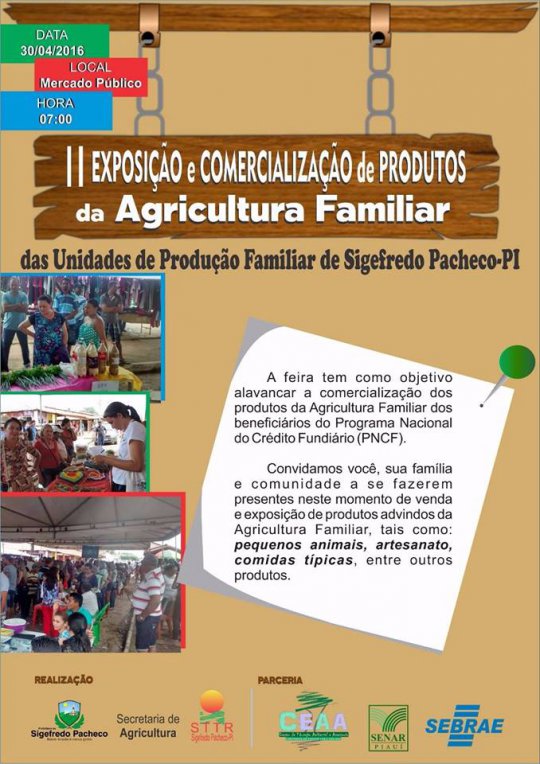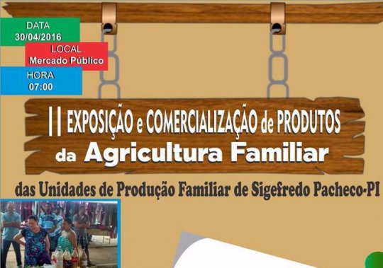 As part of the celebrations Sigefredo Pacheco of political emancipation of birthday and Labor Day, the city government in partnership with the Secretariat of Agriculture and Rural Workers Union, held on 30 April, 07: pm, the II Exhibition and Marketing families of agricultural Products of families Production Units Sigefredo Pacheco.